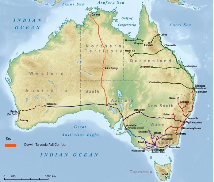 This railway comprises 824 kilometre standard gauge section from Tarcoola to Alice Springs that opened in 1980 and a 1420 kilometre standard guage section from Alice Springs to Darwin that opened in 2004.